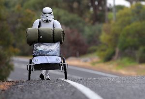 Stormtrooper Paul French is pictured on day 5 of his over 4,000 kilometre journey from Perth to Sydney walking along Old Mandurah road approximately 20 kilometres from Mandurah on July 15, 2011 in Perth, Australia. French aims to walk 35-40 kilometres a day, 5 days a week, in full Stormtrooper costume until he reaches Sydney. French is walking to raise money for the Starlight Foundation – an organisation that aims to brighten the lives of ill and hostpitalised children in Australia. (Photo by Paul Kane/Getty Images)